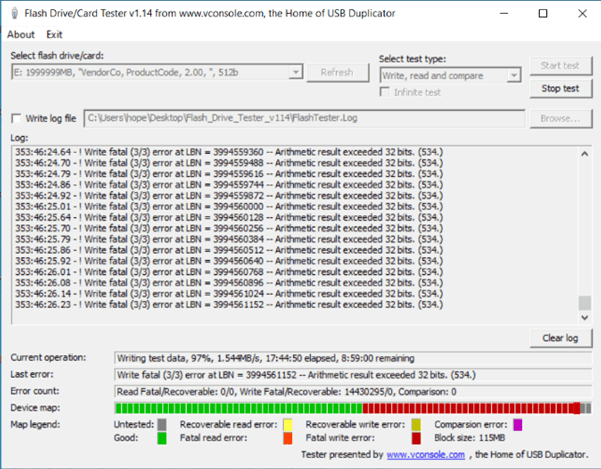 For this test I was using “Flash Drive/Card Tester” application visible in screens below and to be honest this was very time-consuming although the most precise one as it is going through every memory block. Unfortunately, that did not finish properly as the computer running the test halted after 360 hours of running, because of some pc error.
